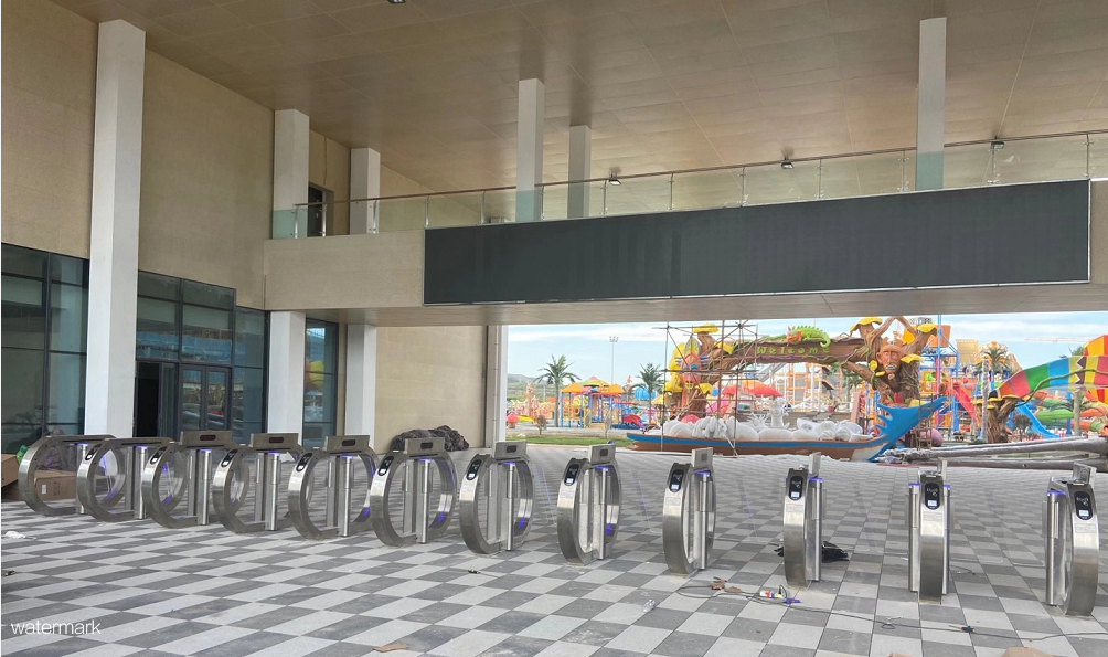 此次水上樂園入口處采用鐵軍智能生產的蘋果速通門,此款速通門的外觀比較細長,機芯結構小,采用離合器和編碼器配合使用,門擺基本是有機玻璃或鋼化玻璃,從外觀看,制作工藝和整體外形都顯得非常高端、大氣。